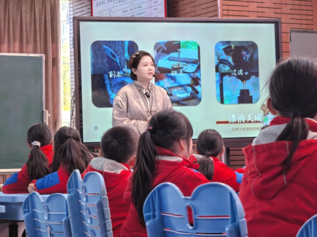 课堂教学展示环节,六合区实验小学孙雅琦老师执教第一节课《溯千年 遇漆器》。孙老师以“完善漆艺作品展”为单元表现性任务统领教学。首先带领学生溯源漆器千年发展脉络,深入探究漆艺核心工艺,体悟 “千髹百涂”背后的匠心精神;进而引导学生从造型设计的巧思、工艺技法的精妙、文化底蕴的深厚等多个维度,赏析不同时代的漆器代表作品,沉浸式感受传统漆器的独特美学与文化魅力。