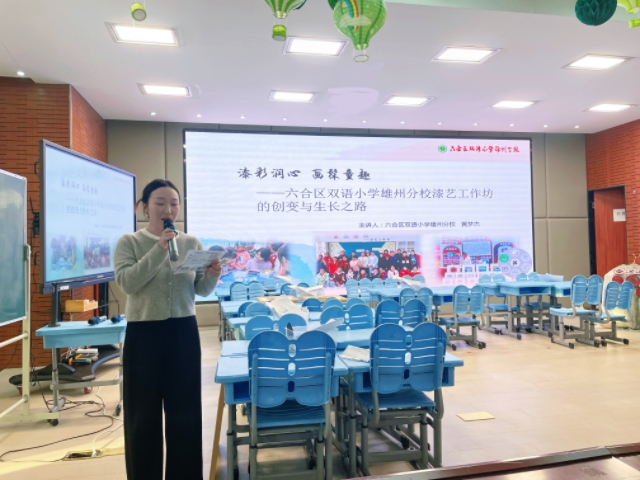 六合区双语小学雄州分校黄梦杰老师作了《漆彩润心 画髹童趣——六合区双语小学雄州分校漆艺工作坊的创变与生长之路》主题讲座。黄老师系统梳理了学校漆艺课程的实施历程、建设要点、实践成果与未来规划,为与会教师提供了可复制的课程落地范式。