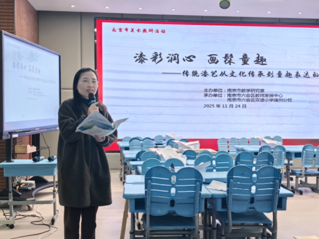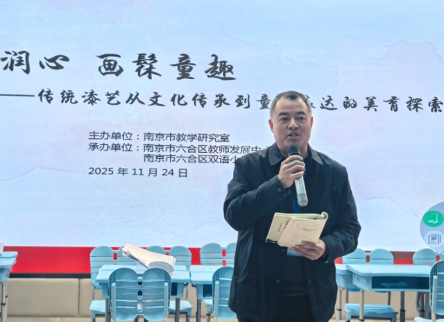 为弘扬中华传统漆艺文化,深耕美育育人实践,2025年11月24日下午,由南京市教学研究室主办、六合区教师发展中心承办的“漆彩润心 画髹童趣——传统漆艺从文化传承到童趣表达的美育探索”小学美术教研活动,在六合区双语小学雄州分校成功举办。南京市美术教研员祖金明、江北新区美术教研员黄绍、六合区教师发展中心副主任郑雪峰、六合区美术教研员王兰平、六合区教师发展中心张远标老师,以及各区美术教师代表齐聚一堂,共同探索传统漆艺与童趣表达的实施路径。