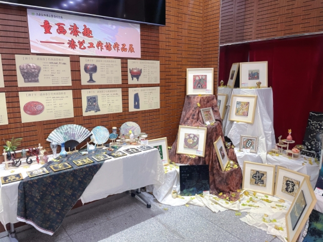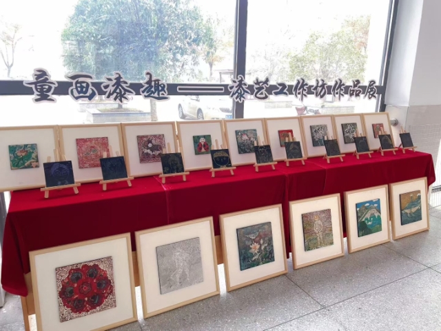 教研活动开始之前,与会教师参观了“童画漆趣——漆艺工作坊作品展”。工作坊的同学们不仅将家乡的山水胜景、民俗文化融入创作,更将童趣创意、个性喜好化为创作灵感。他们以天然漆料为媒介,搭配蛋壳、螺钿、金箔等多样材料,运用镶嵌、撒粉、变涂、起皱等传统漆艺技法,绘出充满想象力的漆画世界。画面里灵动的色彩搭配、独特的材料肌理与真挚的情感表达,不仅吸引了老师们驻足欣赏,更让大家对孩子们的创造力和漆艺工作坊的教学成果给予了高度评价。
