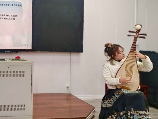 随后,龙袍初级中学胡修华老师与东沟初级中学赵学灵老师联袂带来备课思路《乐扬“非遗”我探寻》,将活动推向高潮。胡老师深入阐述了非物质文化遗产在当代学校教学中传承的必要性与可行路径,强调“活态传承”与“创新性转化”的教研意义。赵老师则通过一曲琵琶独奏《春江花月夜》与一段生动的南京白局表演,淋漓尽致地展现出中国传统器乐的精妙与民间曲艺的独特韵味,让在场教师直观感受到非遗艺术的感染力。